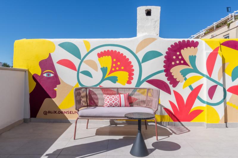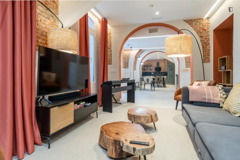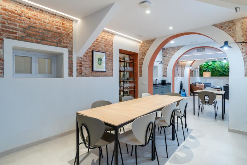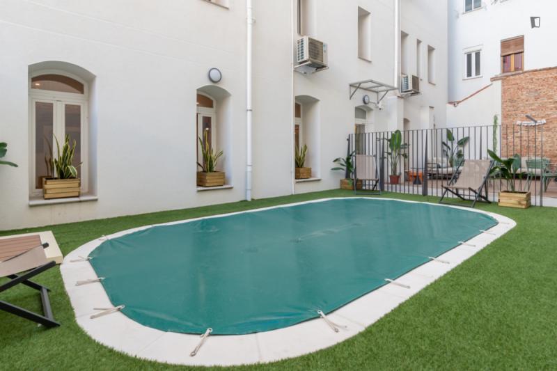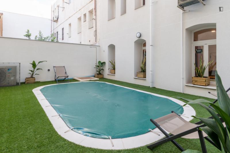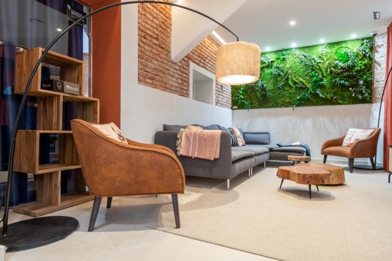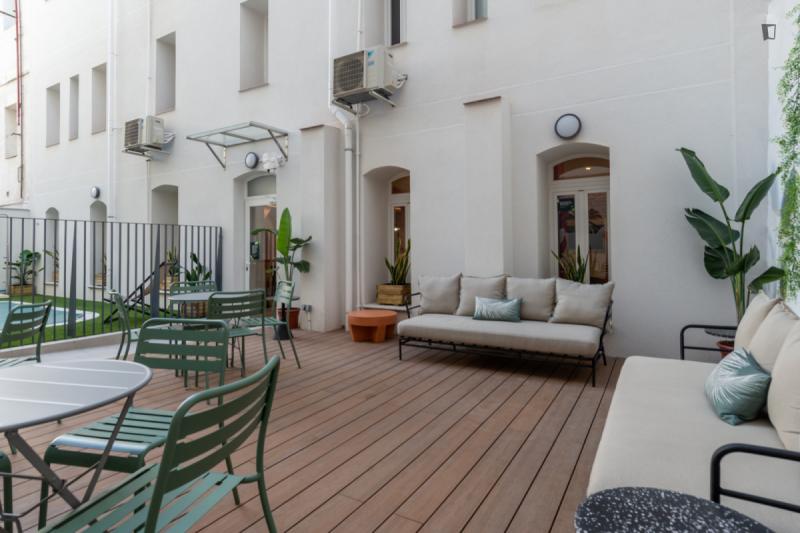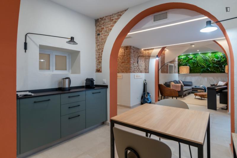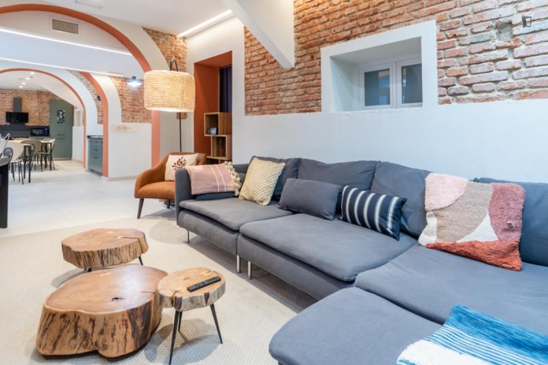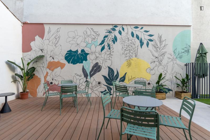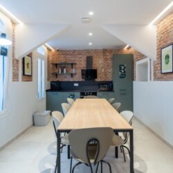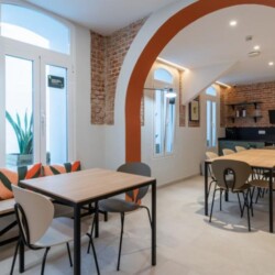 This coliving offers 57 units and boasts 370 m2 of shared spaces. Residents can enjoy a garden, a swimming pool, terraces with barbecues, a coworking area, a gym, a cinema room, a relaxation zone, an event space, and a communal kitchen. Please notice this landlord only accepts young professionals and not students. Also, the notice period to terminate your contract is 30 days, with the minimum stay of 3 months to be respected.
