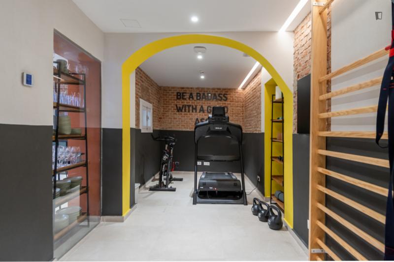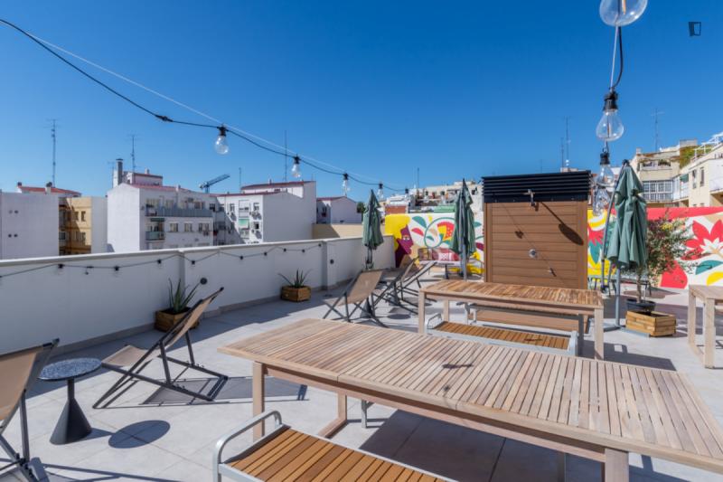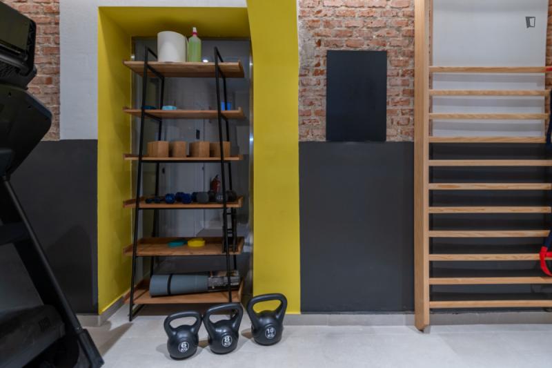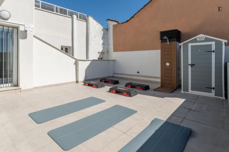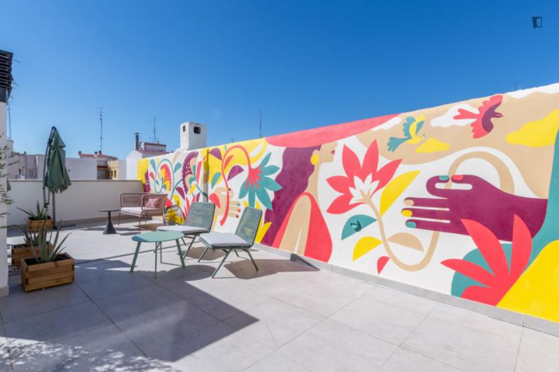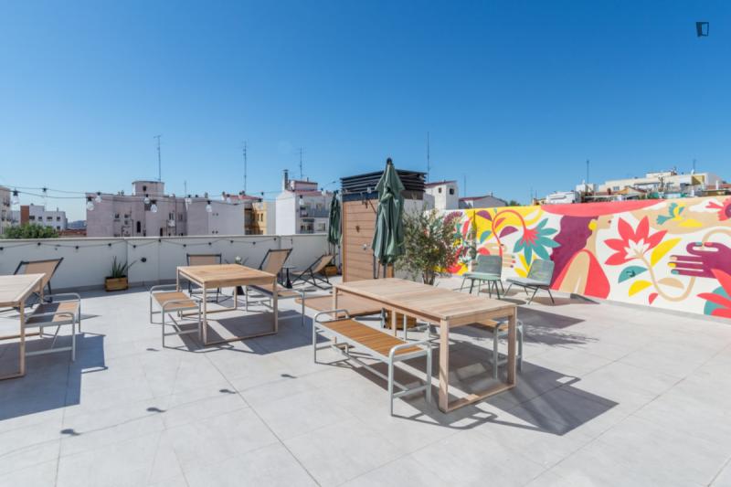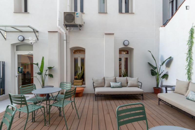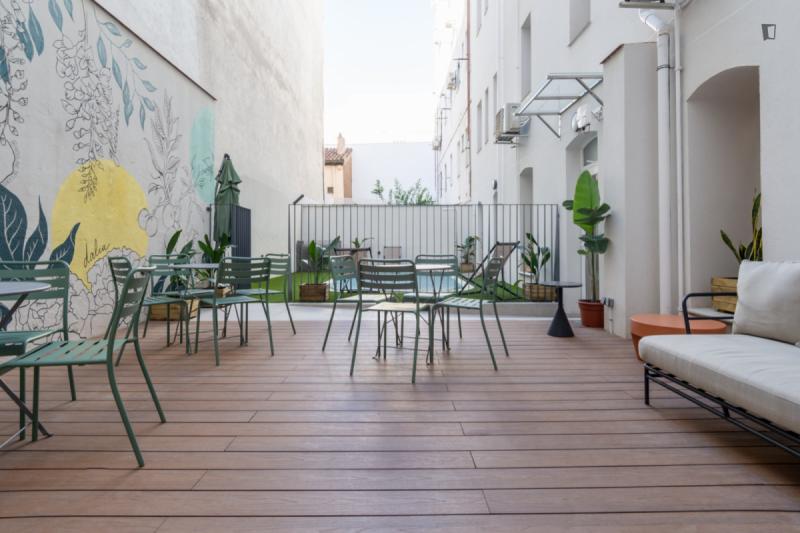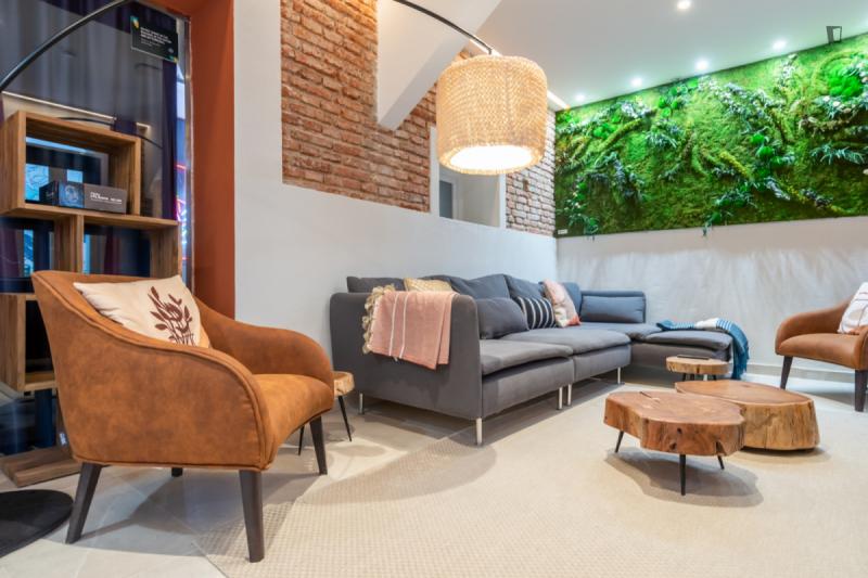 This coliving offers 57 units and boasts 370 m2 of shared spaces. Residents can enjoy a garden, a swimming pool, terraces with barbecues, a coworking area, a gym, a cinema room, a relaxation zone, an event space, and a communal kitchen. Please notice this landlord only accepts young professionals and not students. Also, the notice period to terminate your contract is 30 days, with the minimum stay of 3 months to be respected.