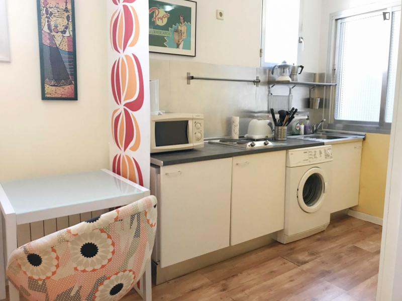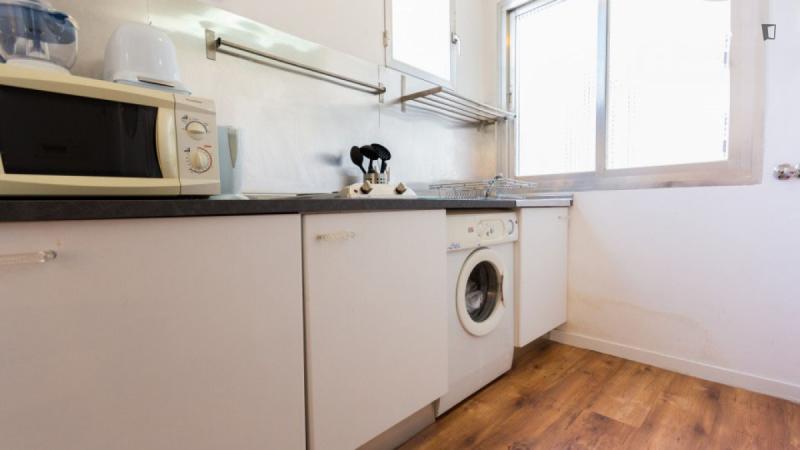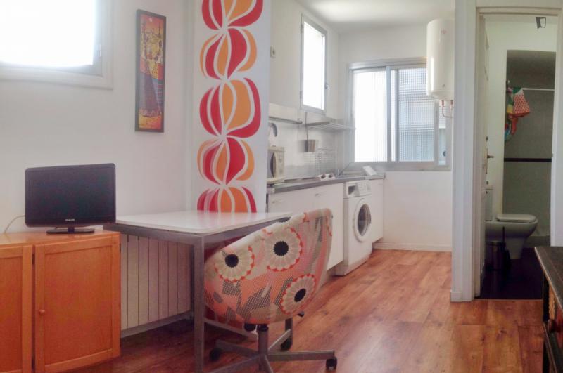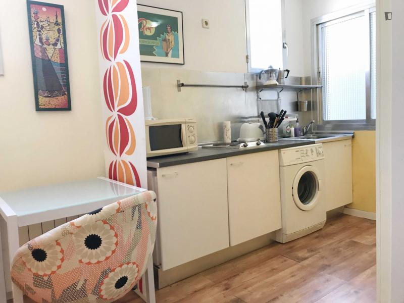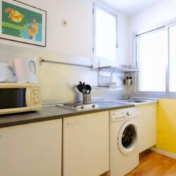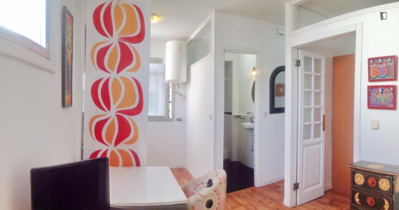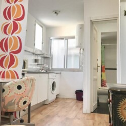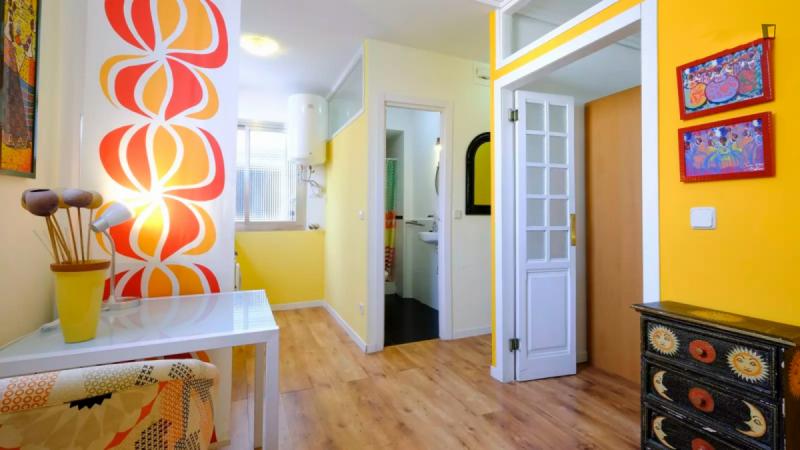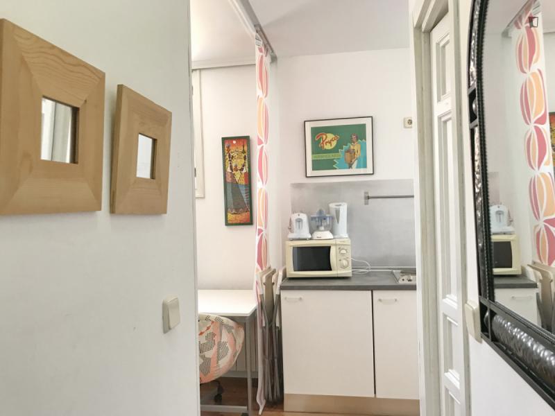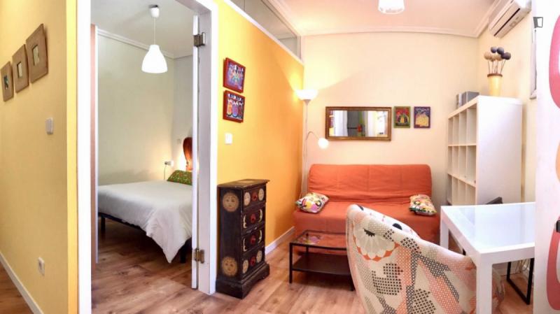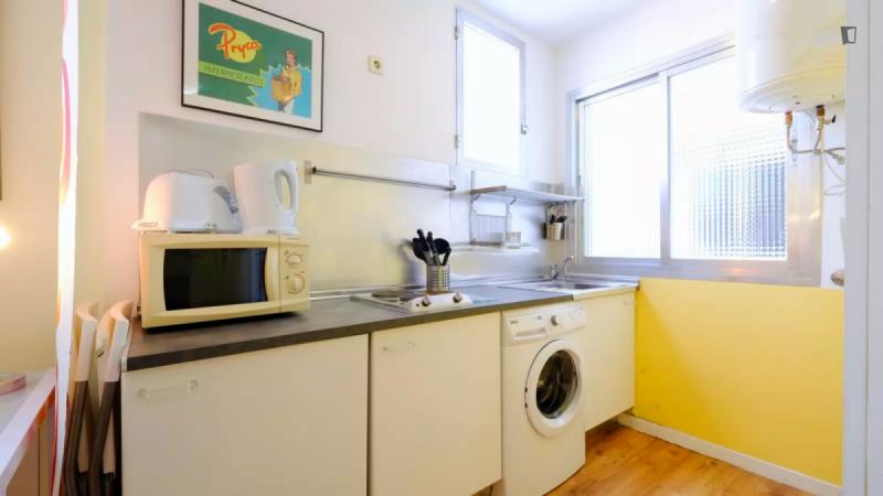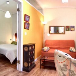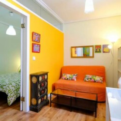 If you are looking for a place to stay in the center of Madrid for when you study abroad, then take a look at this place in Chamberí, just a couple of blocks from Gran Vía, it is a great option for you. The apartment has a bedroom, a living room, a kitchen and a bathroom. The room is next to the living room and has a double bed. This apartment is located in a central area of Madrid. The apartment is on the fourth floor of a building. It may be interesting for you to know that the building has a concierge service and a security code. And it is fully equipped with everything you need to live, even with bedding and towels … and all expenses and supplies are included in the rental price!