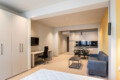 A long work desk with shelves and an office chair makes it easy to study or work from home. The bathroom offers a spacious walk-in shower with a glass door and storage space.