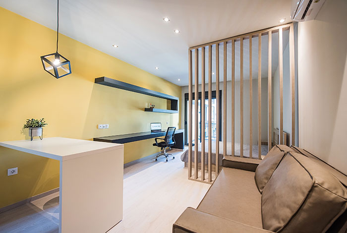 The apartment offers a bright open-plan layout with a comfortable double bed, a sofa bed and a fully equipped kitchen including oven, stovetop, extractor hood and fridge. A dining counter with stools and a dedicated workspace with desk and shelves make it perfect for both studying and working from home.