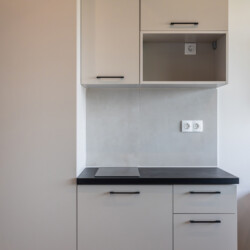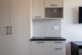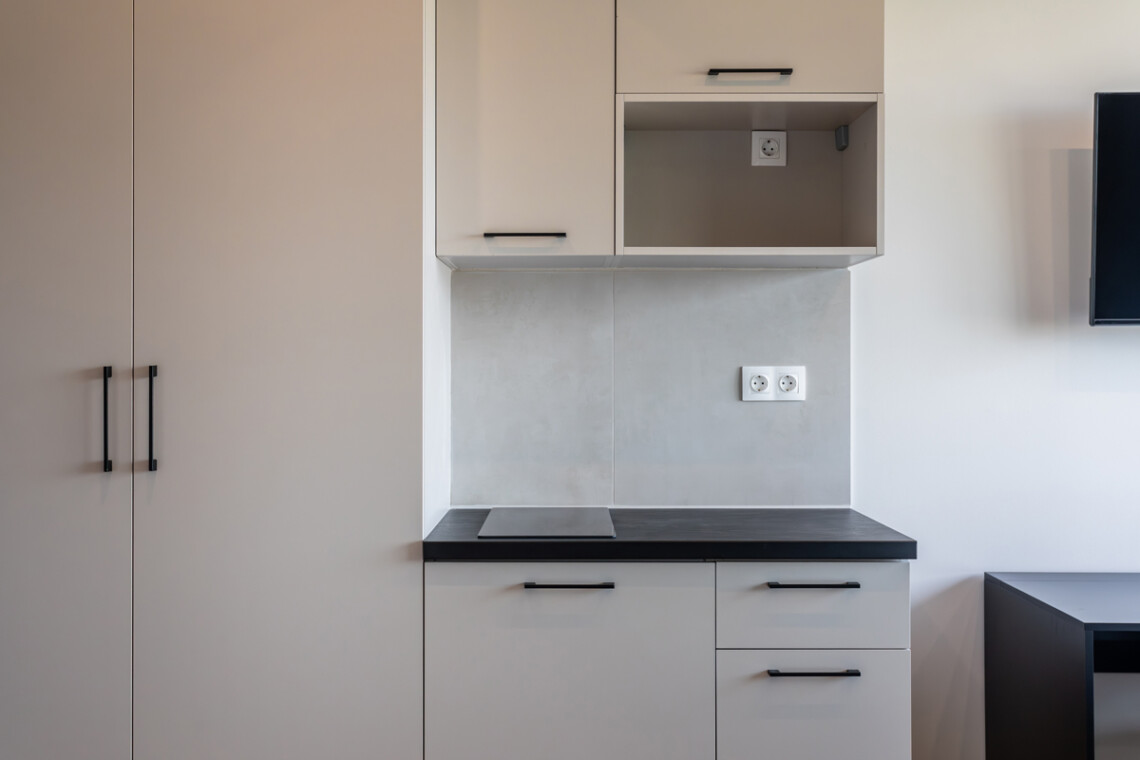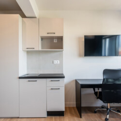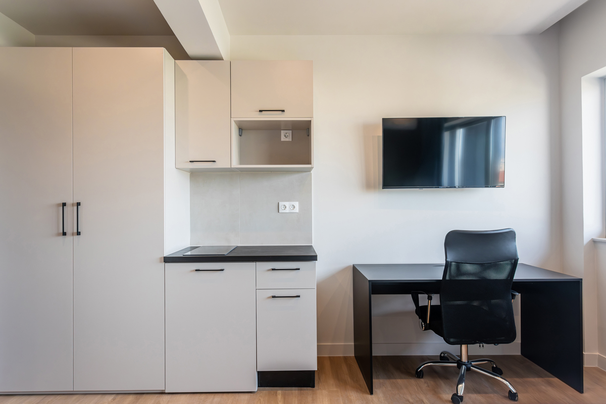 The studio features an open-plan layout with a double bed, built-in wardrobe and a functional workspace with an ergonomic office chair. The kitchenette includes a stovetop and fridge, while the microwave and oven are available in the shared kitchen. Τhe bathroom offers a spacious walk-in shower with a glass door and storage cabinet.