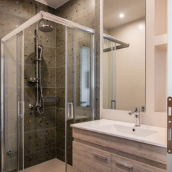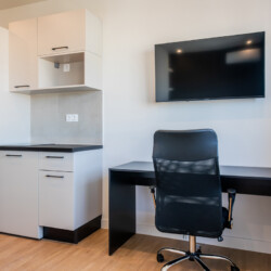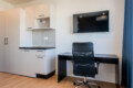 The open-plan space includes a double bed, built-in wardrobe and a workspace with an ergonomic office chair. The kitchenette is equipped with a stovetop and fridge, while the microwave and oven are available in the shared kitchen. Ξ€he bathroom offers a spacious walk-in shower with a glass door and storage cabinet.