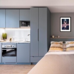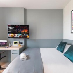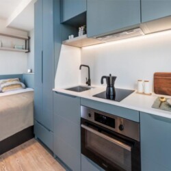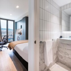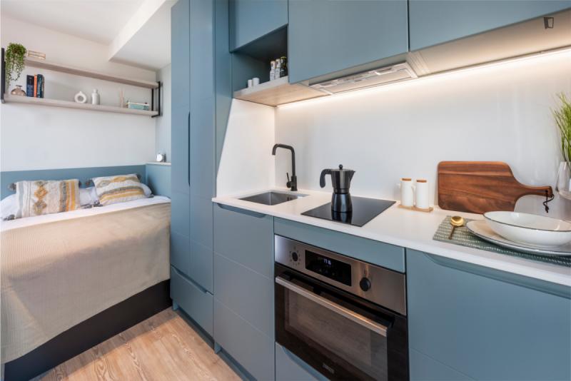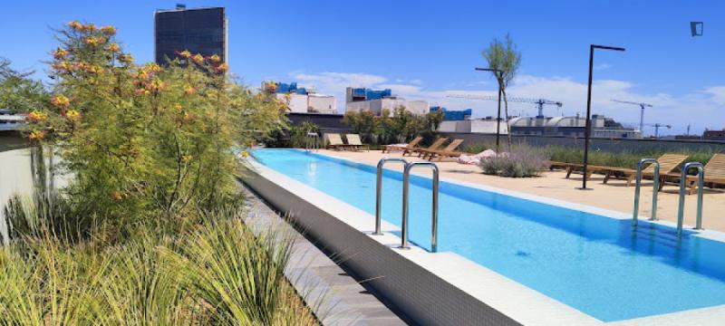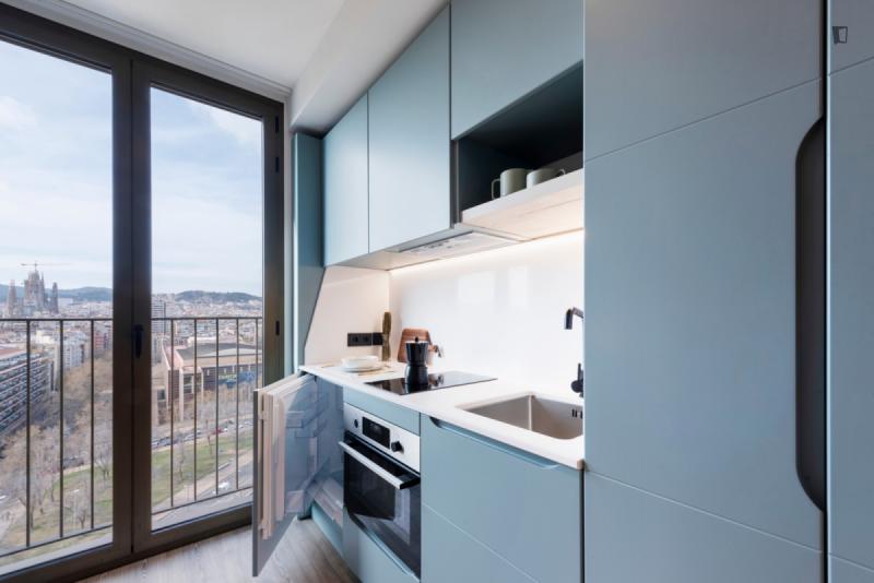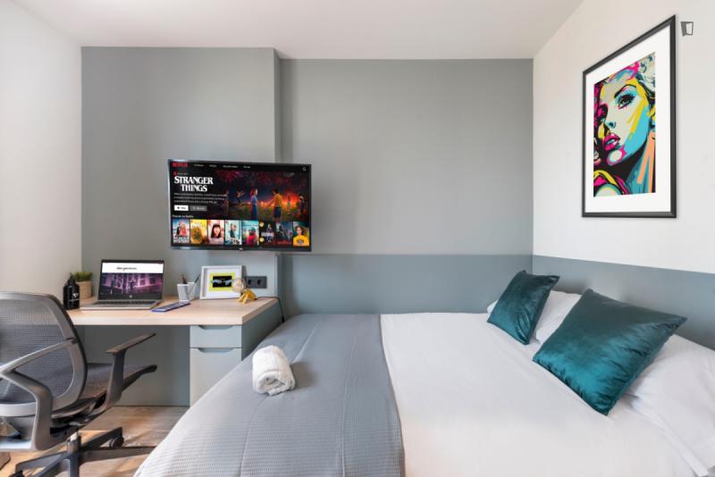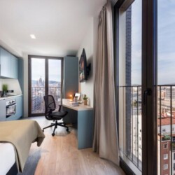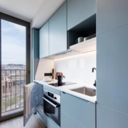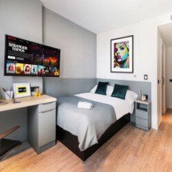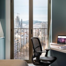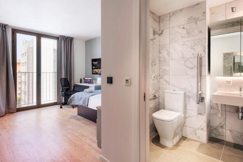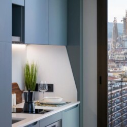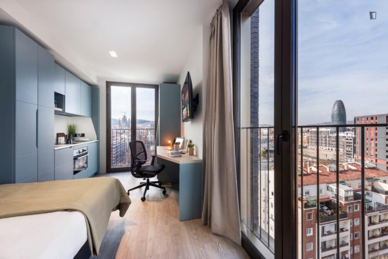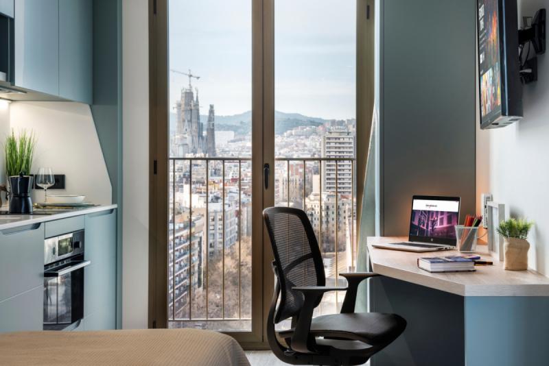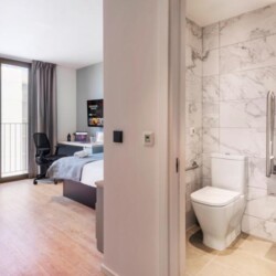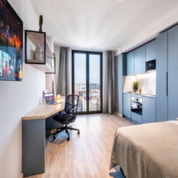 This brand new student Residence in Barcelona is placed in the cool and urban district of Poblenou. Ideal if you’re attending Pompeu Fabra University and want to be a part of the most forward-thinking neighbourhoods in Europe. You are able to choose between five room types across 12 floors. All studios include a kitchen, ensuite bathroom, study space and storage space.