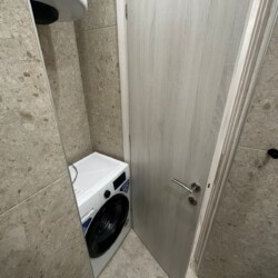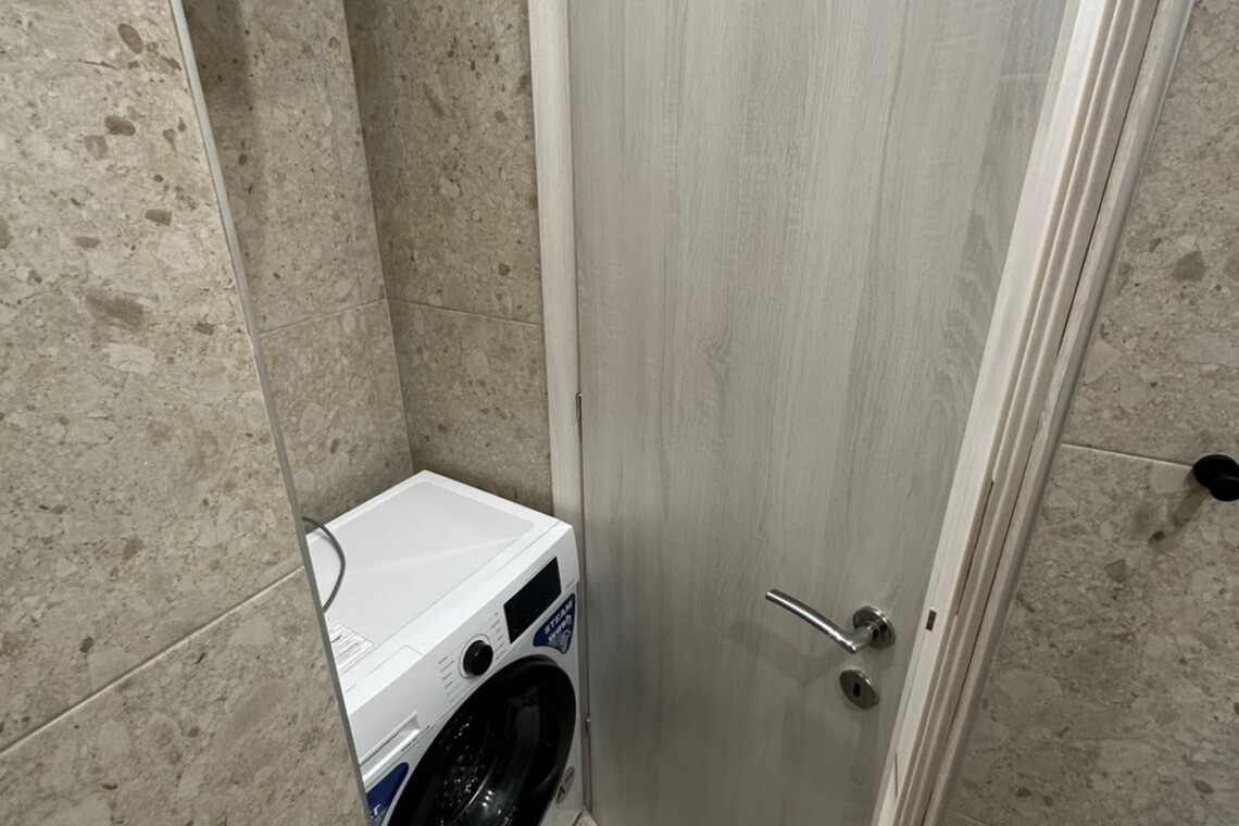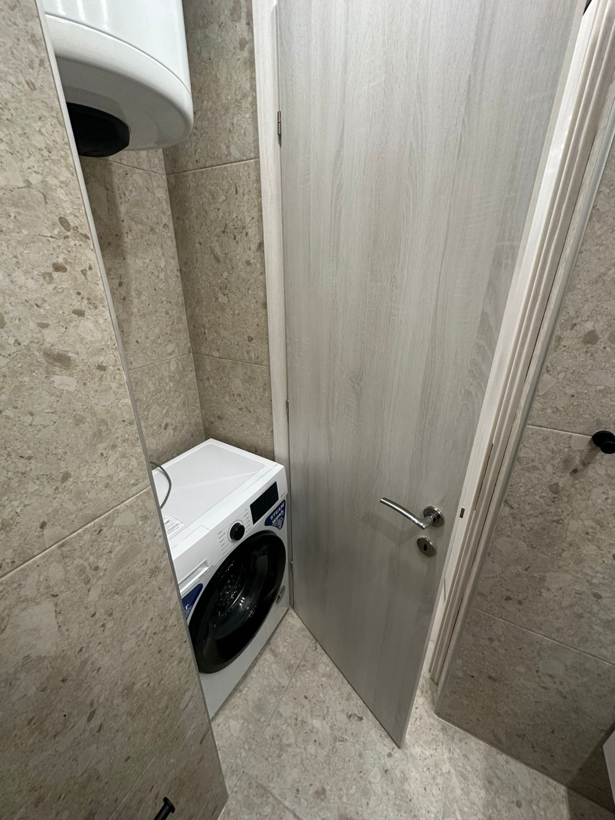 The property includes a bathroom with a washing machine, a fully equipped kitchen with an oven, refrigerator, and microwave, as well as a double bed and a double-door wardrobe in the bedroom.