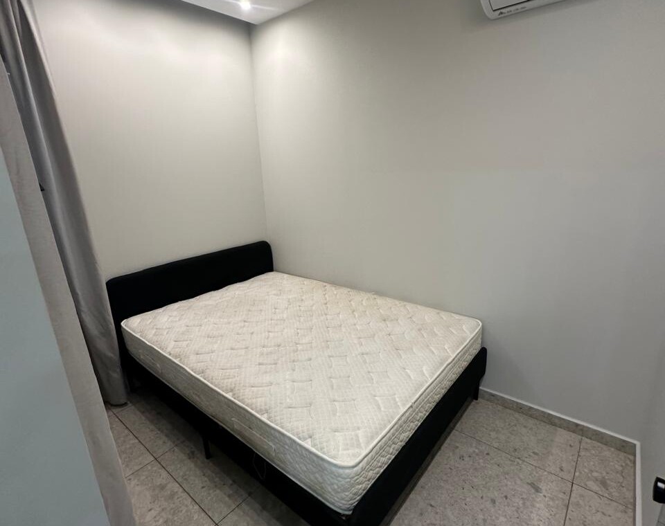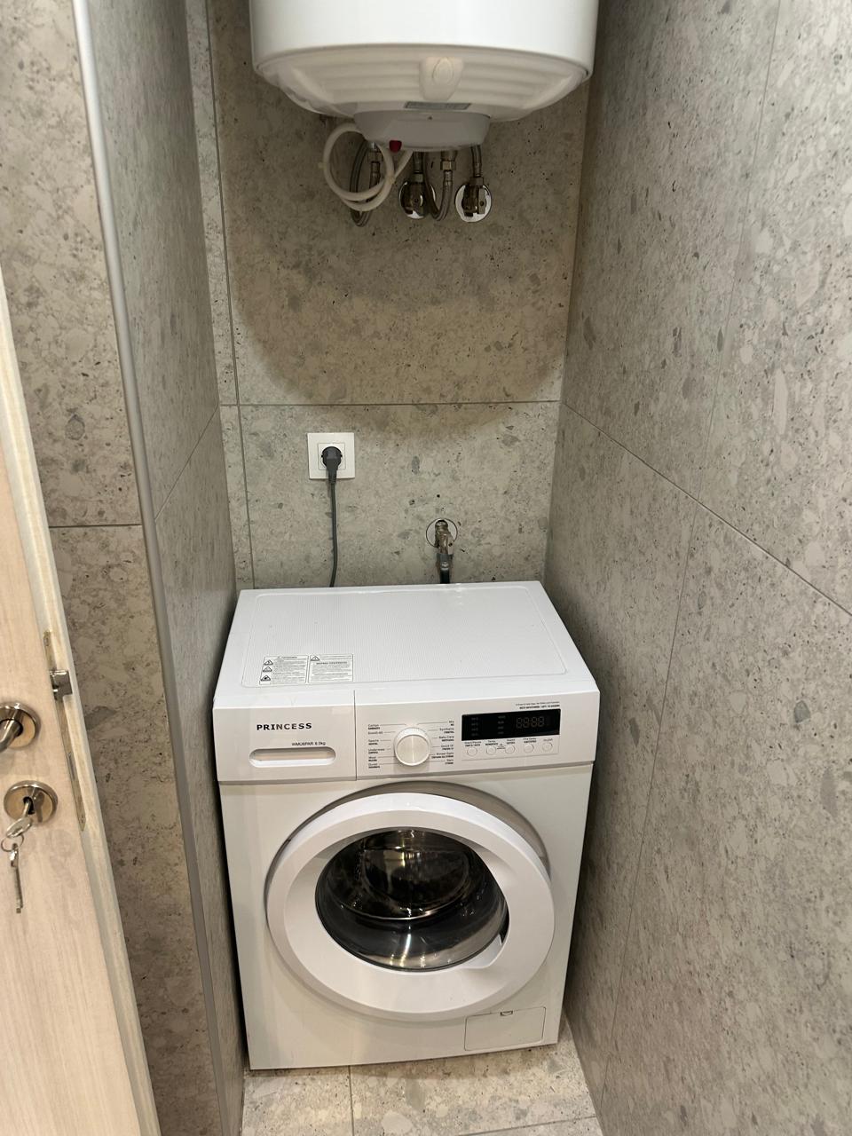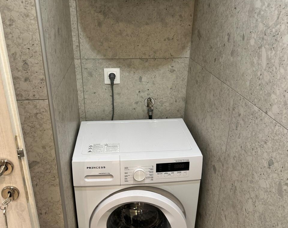 The property includes a bathroom with a washing machine, a fully equipped kitchen with an oven, refrigerator, and microwave, as well as a double bed and a double-door wardrobe in the bedroom.