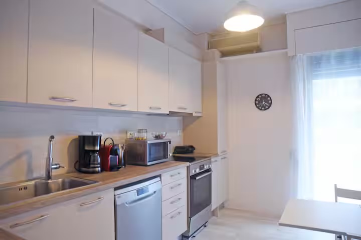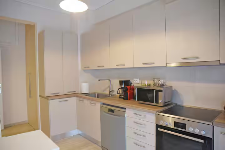 The kitchen is fully equipped with all the necessary appliances, including an oven, stovetop, refrigerator, microwave, dishwasher, filter coffee maker, Nespresso machine, toaster, as well as a wide variety of cookware.