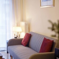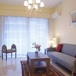A spacious and stylish apartment located in the area of Palaio Faliro, two blocks away from the seasore. It features two bedrooms, one large bathroom and one WC, as well as a large fully equipped kitchen and a living room with a dining area.
