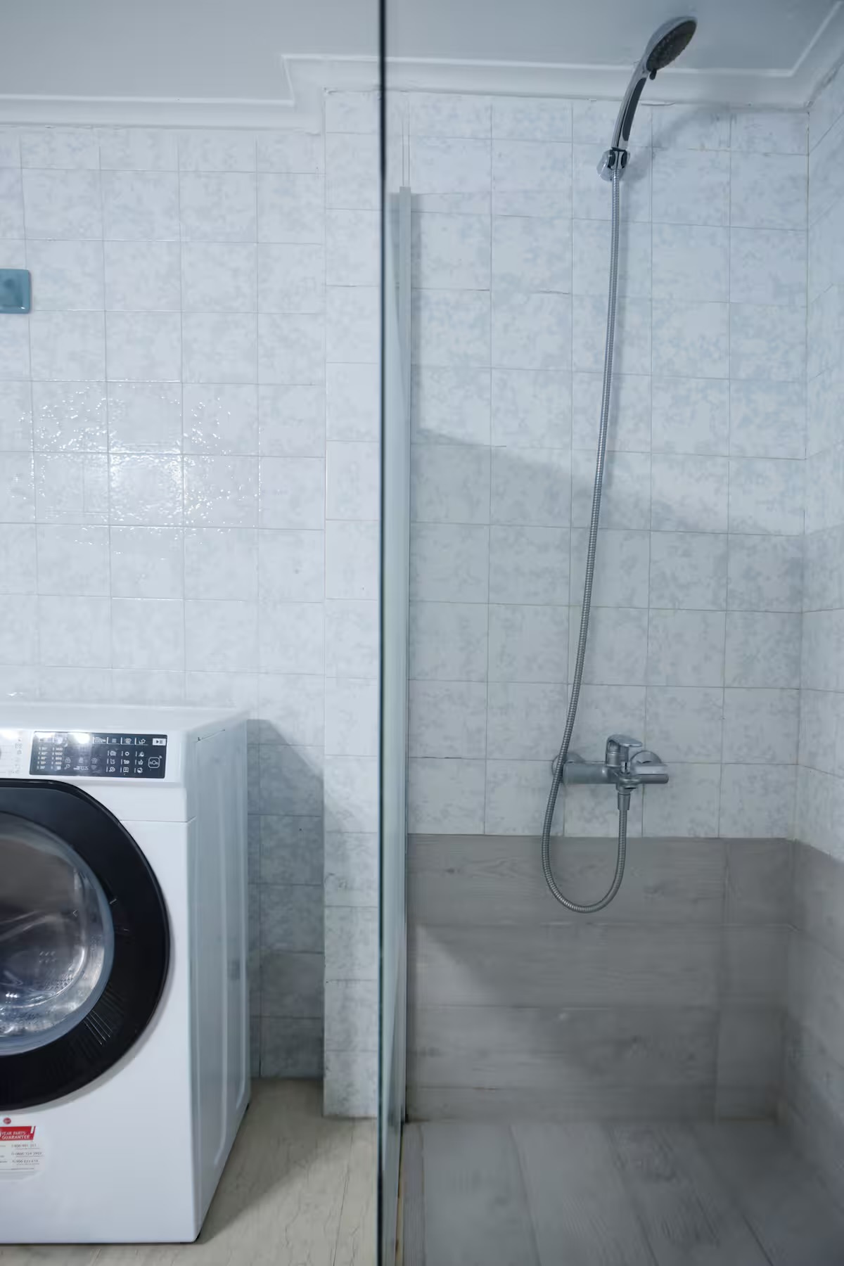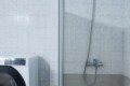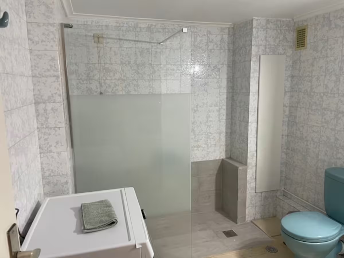 The large bathroom also includes a washing machine.