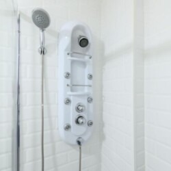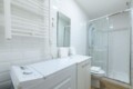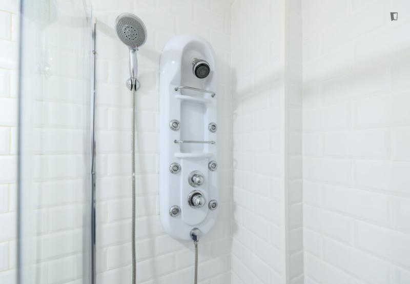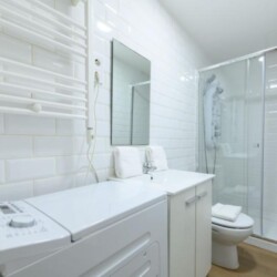 • Baño completo con ducha, WC, espejo, lavadora y espacio de almacenamiento.