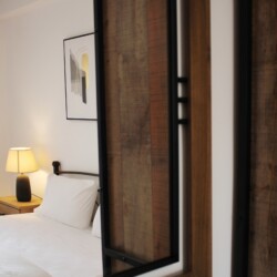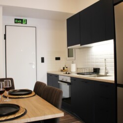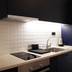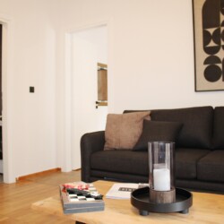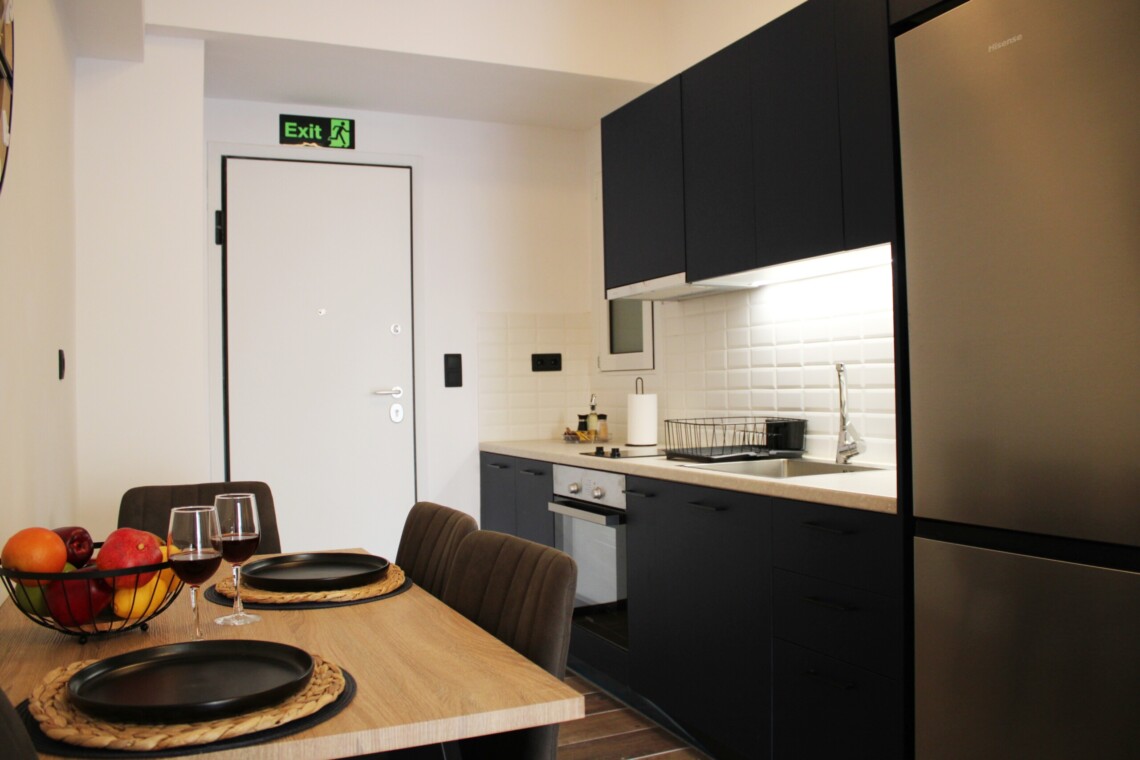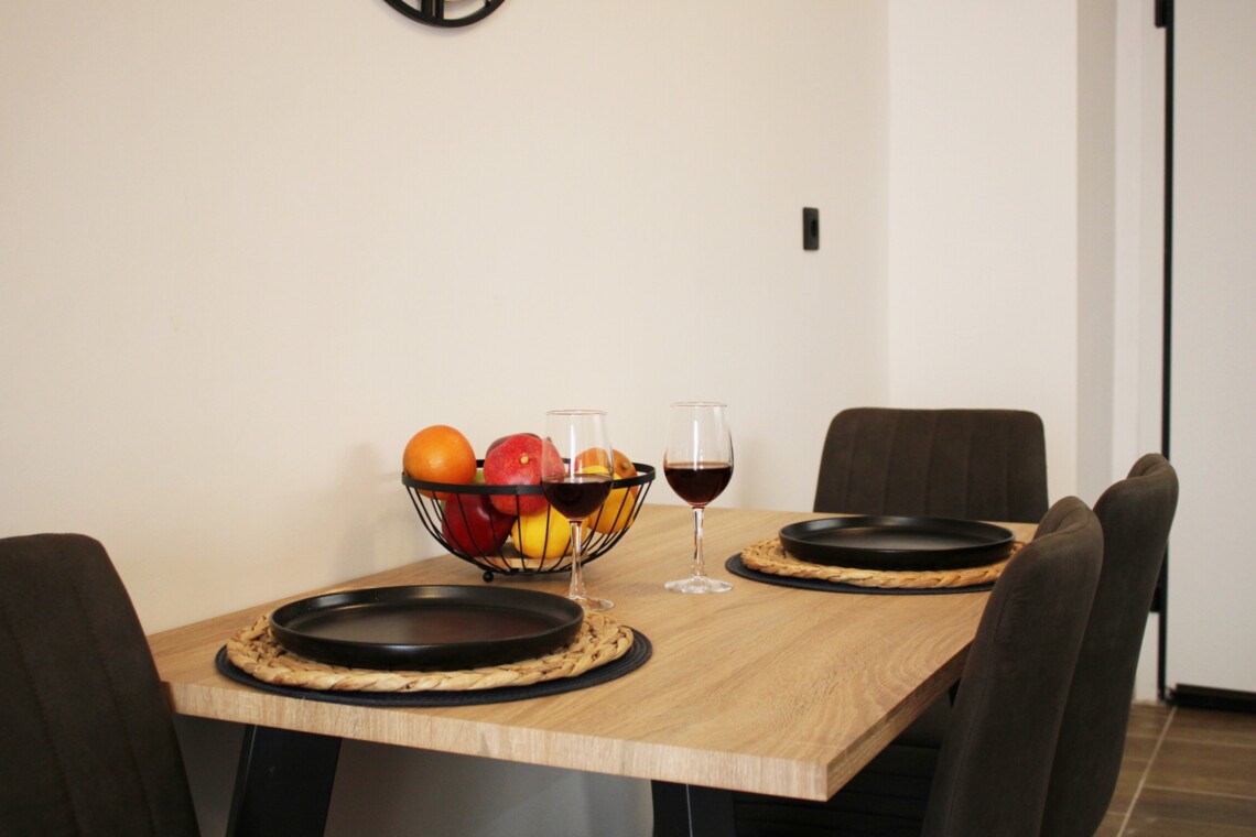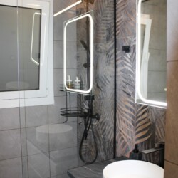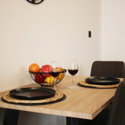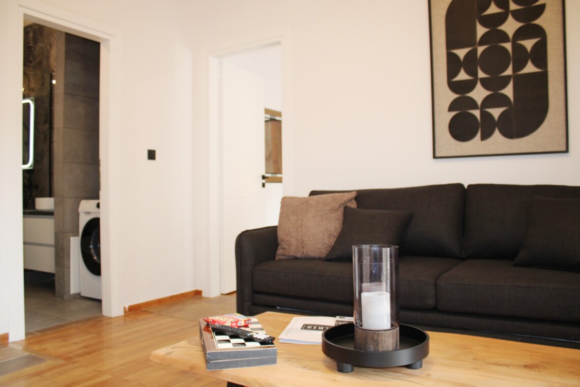 The bedroom is fitted with a premium-quality mattress, fresh linen, and towels, ensuring a restful stay. The bathroom is fully renovated and includes a walk-in shower, while air-conditioning and central heating throughout the apartment keep it comfortable year-round.