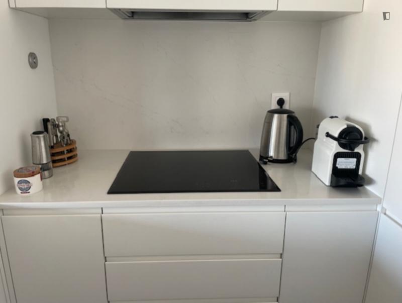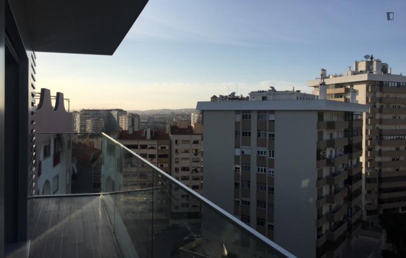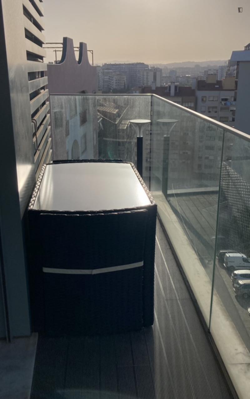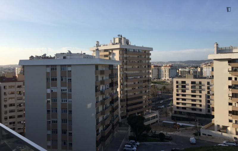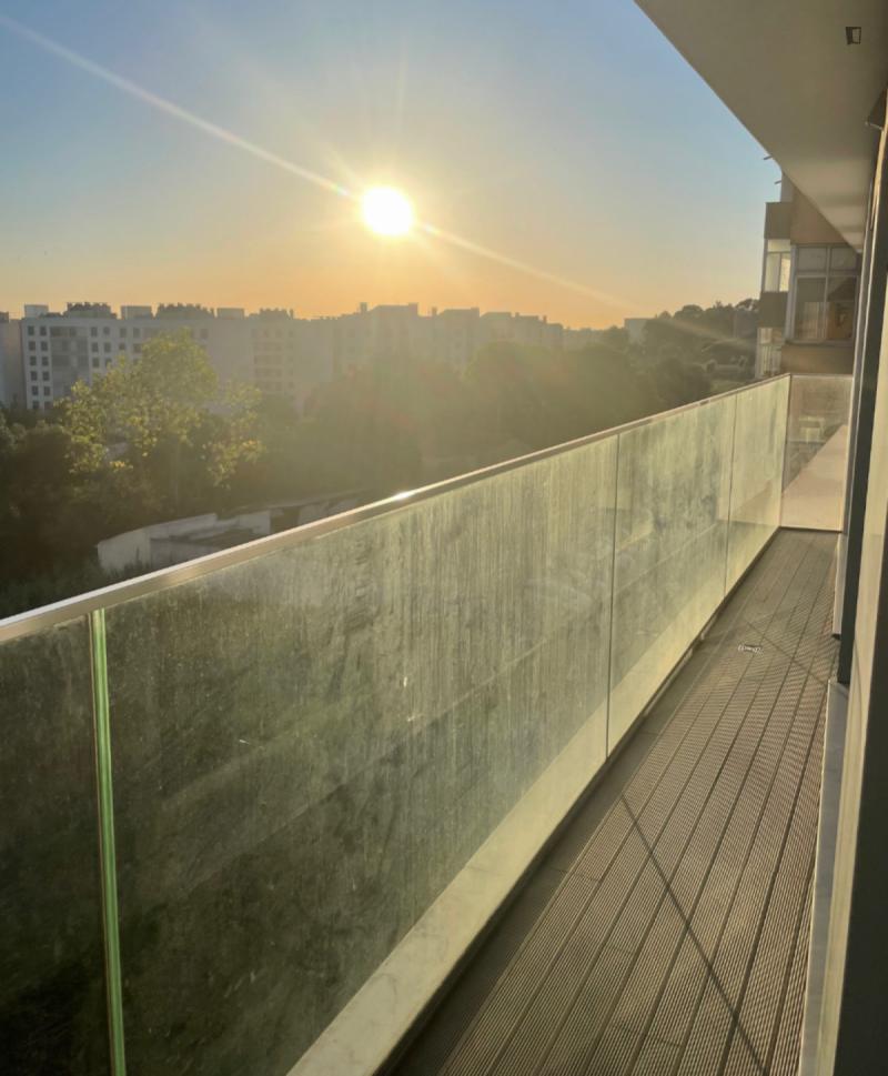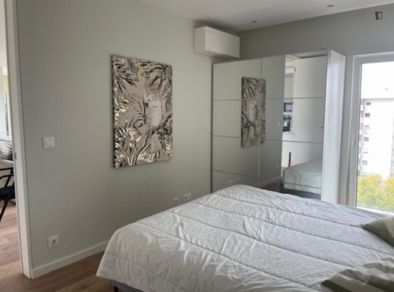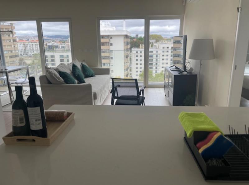 Welcome to this beautiful flat! Great location and amazing view. 5m walk from: Hospital Lusíadas, subway, restaurants, pharmacies, supermarkets, and schools. The flat features a bedroom with a private bathroom, a shared bathroom, a living room, and a kitchen. Great view, balcony, elevator, parking. Household appliances: dishwasher, washing machine and dryer, induction hob, microwave, fridge-freezer. Fully equipped and furnished. Please note, you must pay two months’ rent in advance and a security deposit.