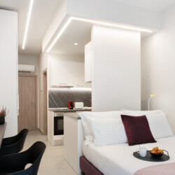 Crafted with urban elegance, the Comfort Residence offers an immersive city-living experience, perfect for two guests. Spanning a generous 27 square meters, it seamlessly merges inviting comfort with complete residential facilities. With ample daylight illuminating its interiors, a double bed for serene rest, working desk, high speed internet, spacious cupboards for all your belongings, and a smart flat-screen TV to enhance your leisure moments, it’s a stay designed for relaxation.