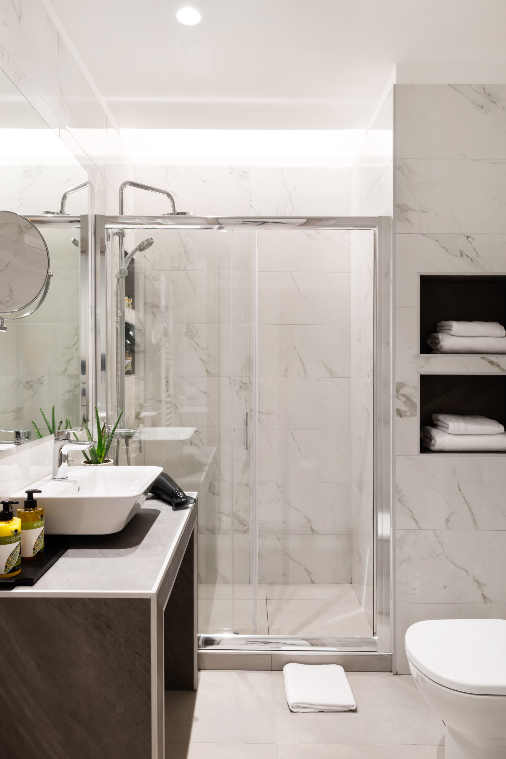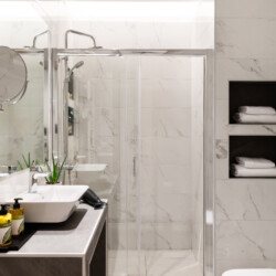 The bathroom, complete with a walk-in shower and advanced facilities, exudes contemporary luxury.