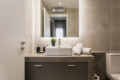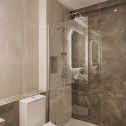 The bathroom includes a spacious walk-in shower with a glass door and storage cabinet. The apartment is equipped with air conditioning (heating & cooling), a solar water heater, LED lighting, energy-efficient double-glazed windows, blackout curtains, sound and thermal insulation, a fire-resistant security door and a 43” TV.