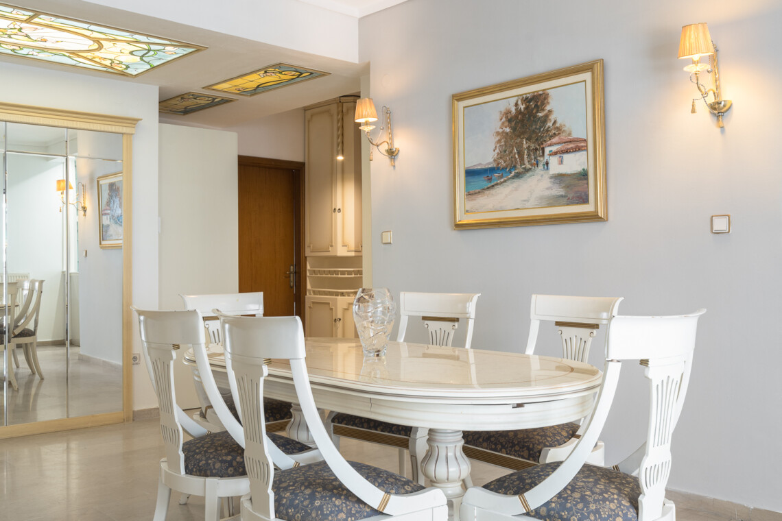 Dining Areas: Two dining tables—one in the kitchen and one in the living room