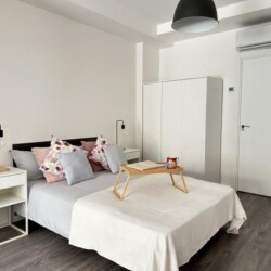 The bedroom, integrated into the same area, features a double bed with two bedside tables, and two spacious wardrobes for storage.