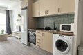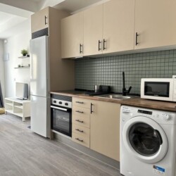 The kitchen is fully equipped with a fridge, ceramic hob, oven, microwave, and washing machine. Next to the kitchen, a dining table for two creates a cozy dining space.