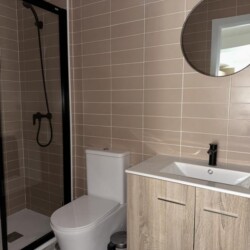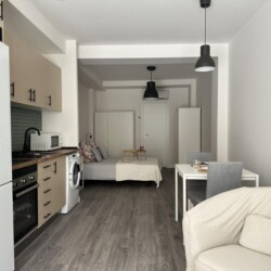 Lastly, the bathroom includes a large walk-in shower, maintaining the studio’s modern and functional design.