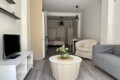 In the living area, there is a comfortable sofa in neutral tones, along with an elegant coffee table, perfect for relaxing. In front of the sofa, a flat-screen TV is mounted on the wall, accompanied by a pair of floating shelves, ideal for storing books and decorative items.