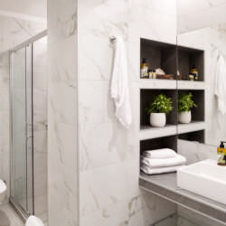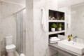 The bathroom features a sleek, walk-in shower, enhancing your comfort and convenience.