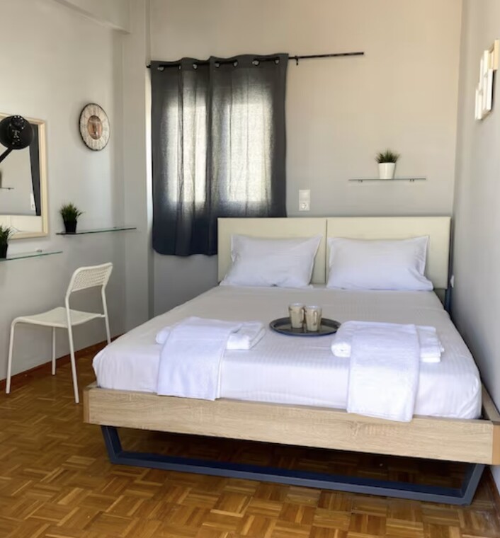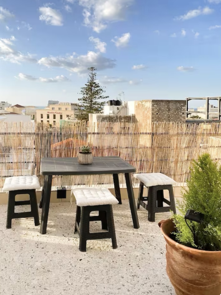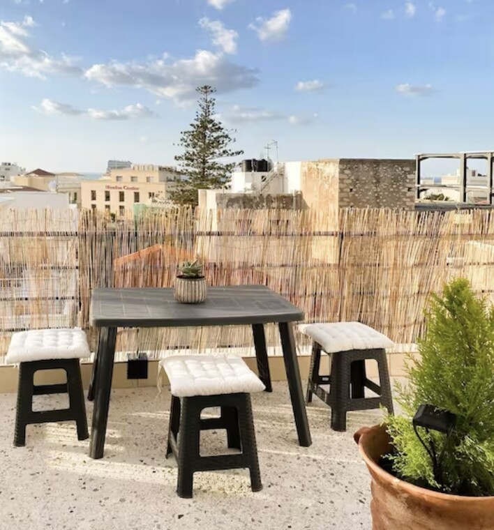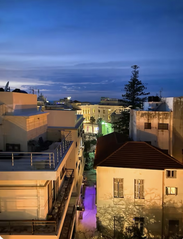 The apartment is located in the heart of Heraklion, just one minute away from the famous Lions Square. It is on the fourth and top floor of the building, and the view from the private terrace is unique. The apartment is 54 sq.m. The entire apartment, terrace, and balcony are yours to enjoy. The whole place has been recently renovated and is fully furnished.