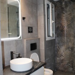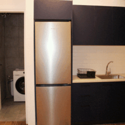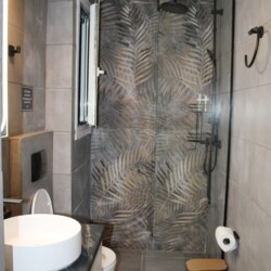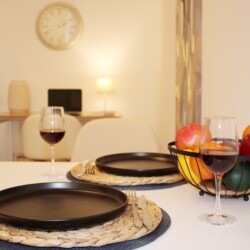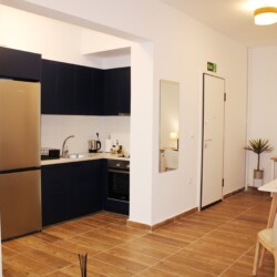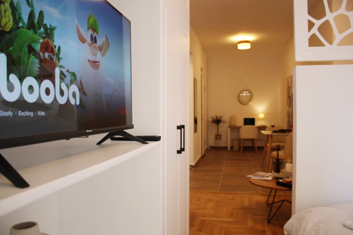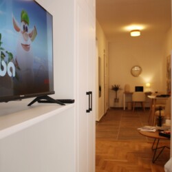 The bedroom is fitted with a premium-quality mattress, fresh linen, and towels, ensuring a restful stay. The bathroom is fully renovated and includes a walk-in shower, while air-conditioning and central heating throughout the apartment keep it comfortable year-round.