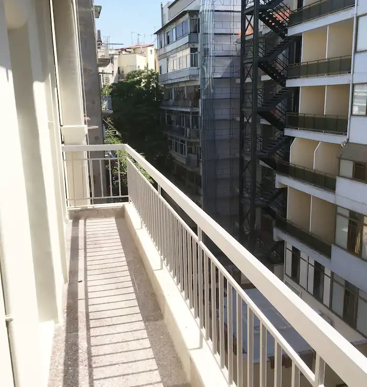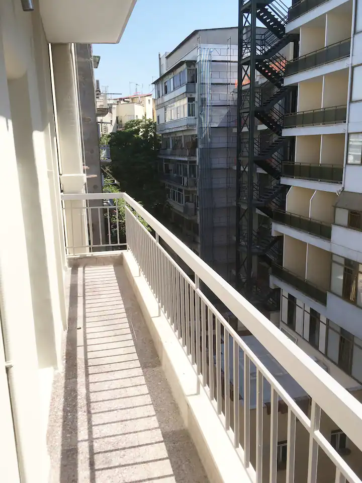 Modern and bright apartment in the center of Thessaloniki near Egnatia Street / Antigonidon Square, totally renovated, spacious balcony with view, 6th floor with elevator, 2 big bedrooms with bed of 160cm x 200cm and large wardrobe + 1 big modern bathroom + huge living room with studio couch, all facilities, international TV, near to seaside, cultural highlights, shopping streets and nightlife – very quiet