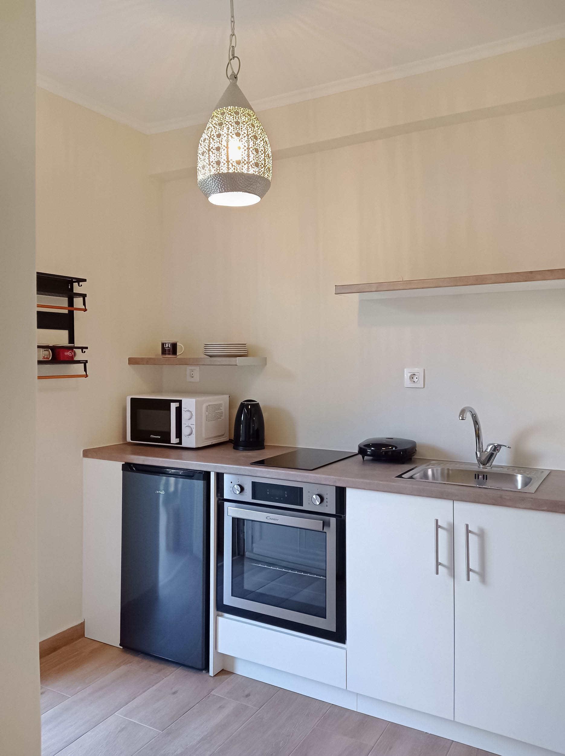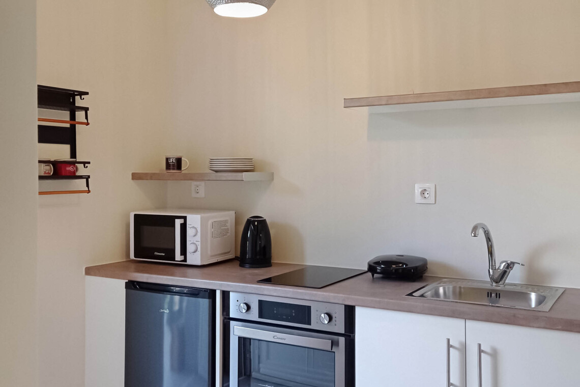 Fully equipped kitchenette (fridge, microwave, coffee maker, oven and cooktop, electric kettle, cookware, and cutlery)