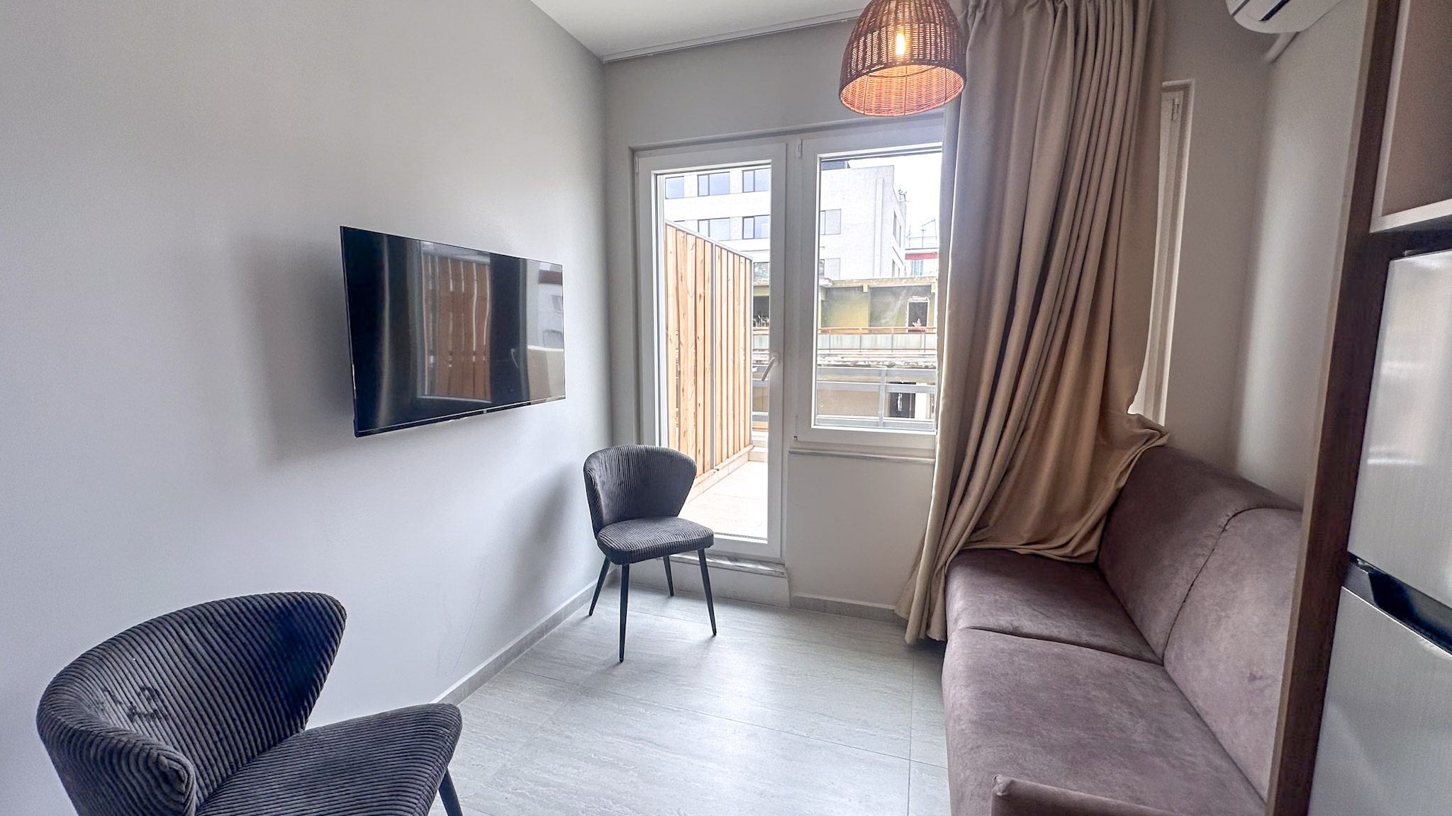 • Bright living room with sofa, TV, and air conditioning