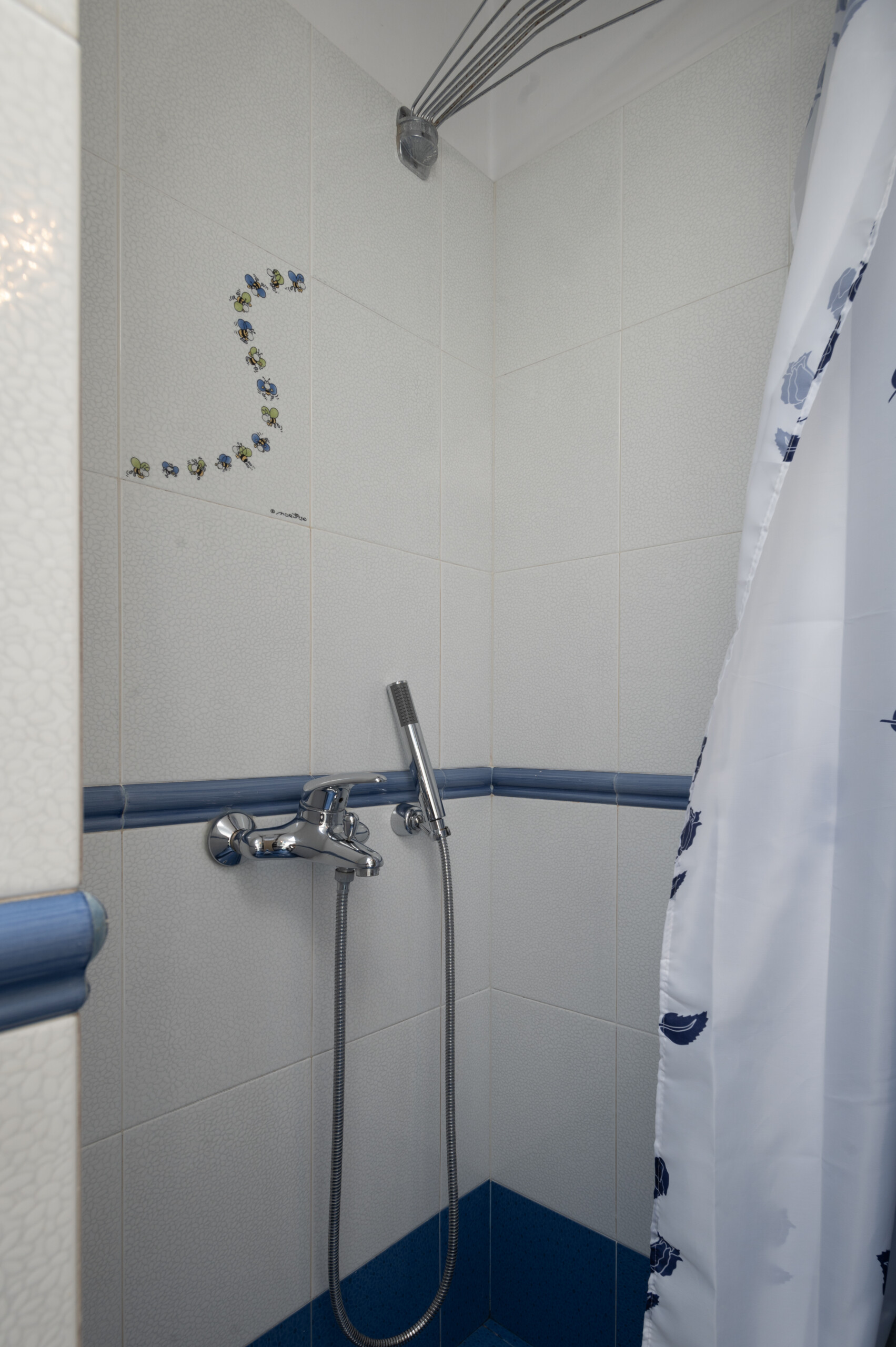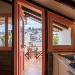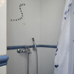 The apartment features a queen-size bed, a private bathroom with shower, and a kitchenette for complete independence. A/C, TV, radio, and speakers provide modern comfort, while the private terrace offers open views toward Palamidi Castle—easily one of the standout features of this space.