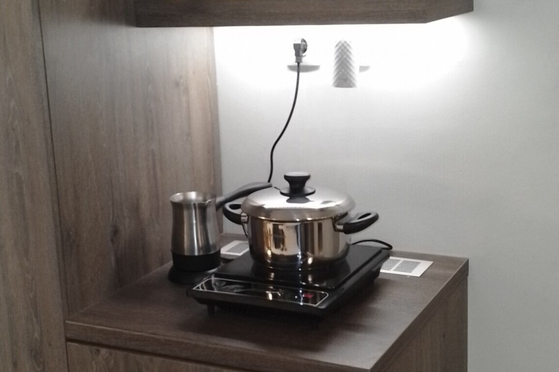 It is fully renovated and furnished. The heating / cooling is provided with air conditioning, there is a smart TV, armored door, elevator, hot water 24/7, and the connection to the internet is made with optical fiber 200mbps. The kitchenette includes a small cooking hob, a cooker hood, and a small fridge but no sink.