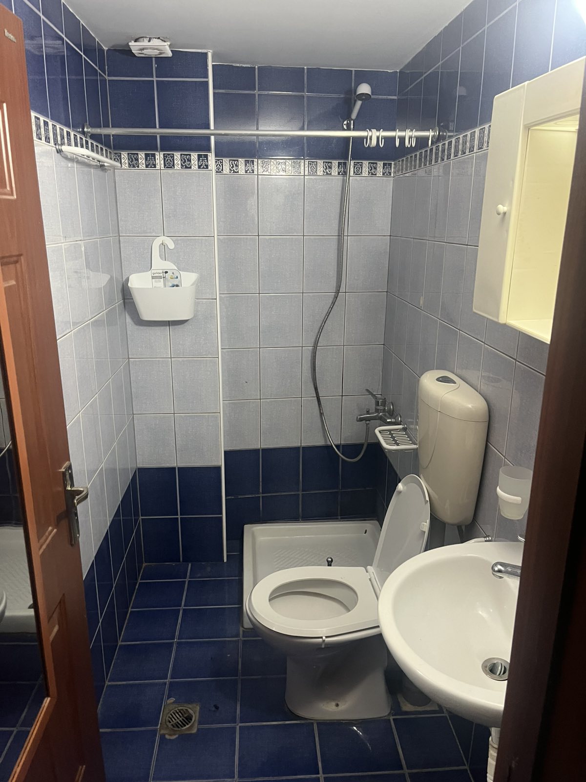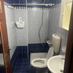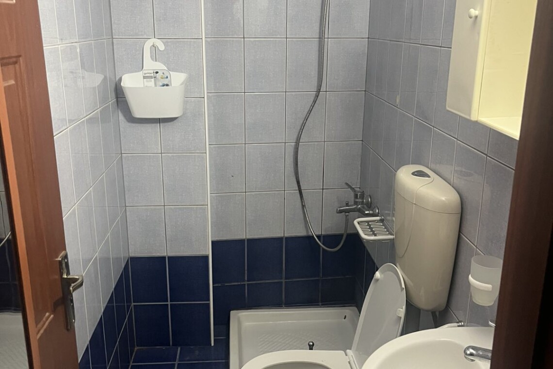 The bathroom is well-maintained, featuring a walk-in shower. The apartment also includes a washing machine, air conditioning for cooling and heating, and reliable WiFi.