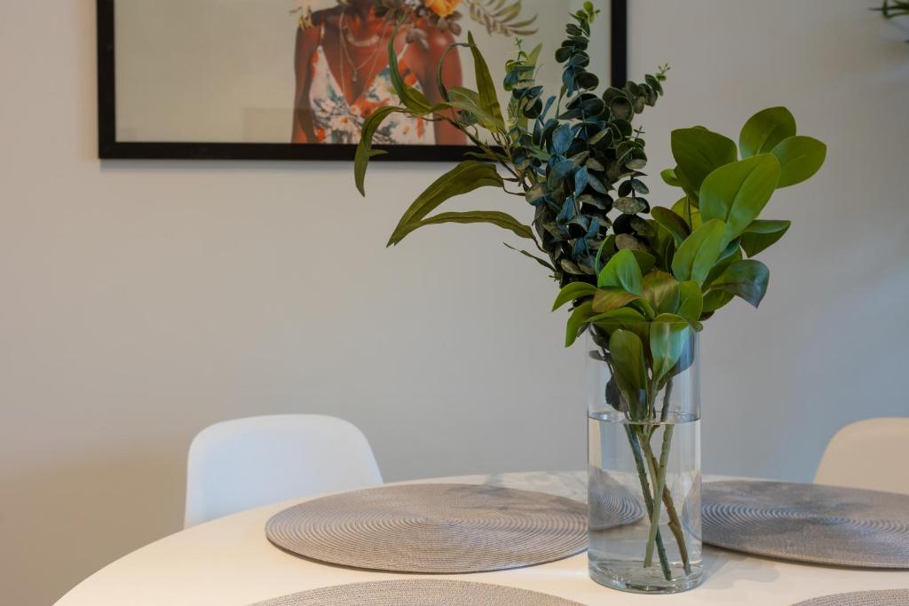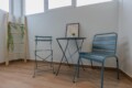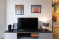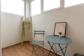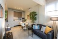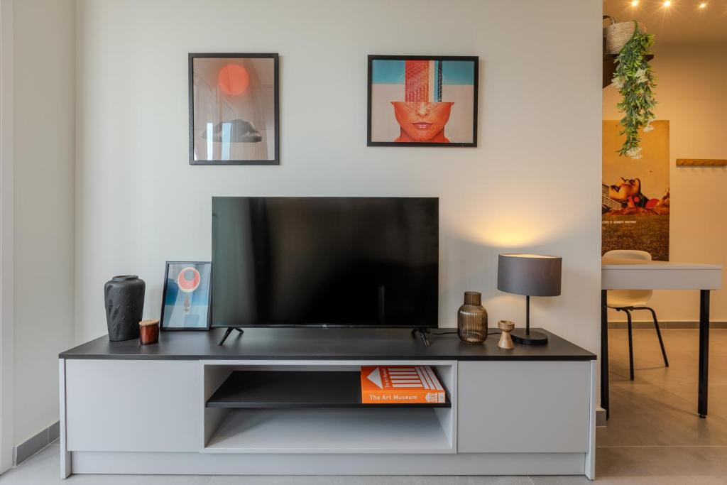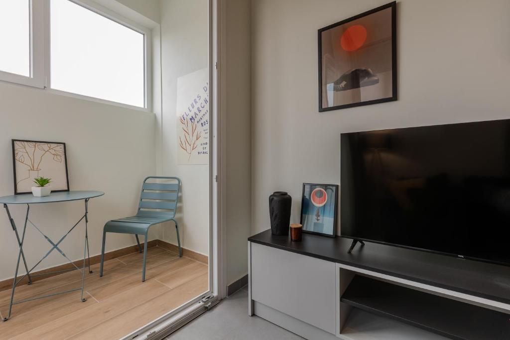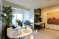 Convenient Amenities: The apartment includes a balcony with city views, a dining area, and a work desk. Additional amenities include a hairdryer, microwave, TV, and a seating area.