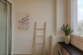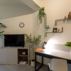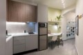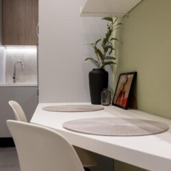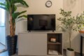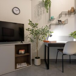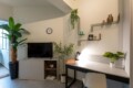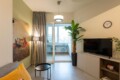 Convenient Amenities: The apartment includes a balcony with city views, a dining area, and a work desk. Additional amenities include a hairdryer, microwave, TV, and a seating area.