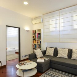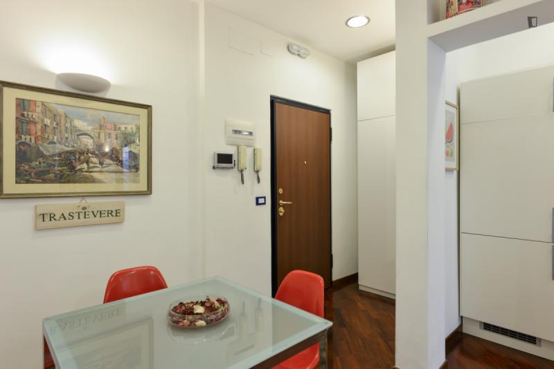 This is the right place for people who want to stay downtown, close to all the attractions, but hate the noise day and night of traffic and crowds. It’s located on a quiet hill above Viale Trastevere, a trendy area with nearby bars, restaurants and historic sites. The atmosphere is quiet and relaxed but close to the vibrant daily life of a non-touristy Trastevere. The apartment has a large living room with a sofa bed, a bedroom with a double bed, a modern bathroom, and a fully equipped kitchen. A silent air conditioning system is ready for summer and winter. The private road 50 m /160 ft up the hill leads to the independent entrance from the private outdoor area. Thus the apartment is on the second floor on the side of the hill. On foot you’ll reach in a few minutes all Universities, Trastevere train station and subway and by bus and tram in a few minutes all sites in the downtown area.
