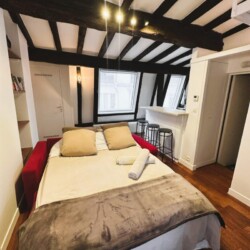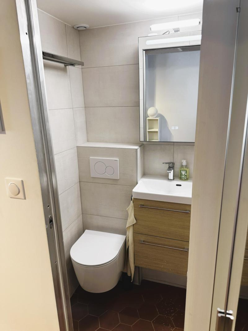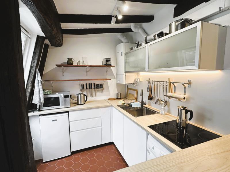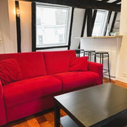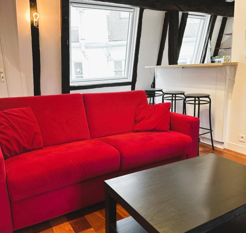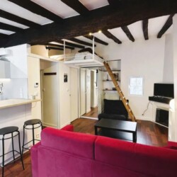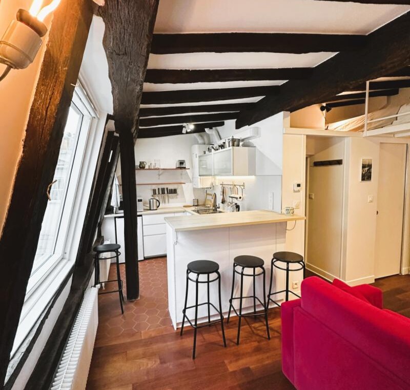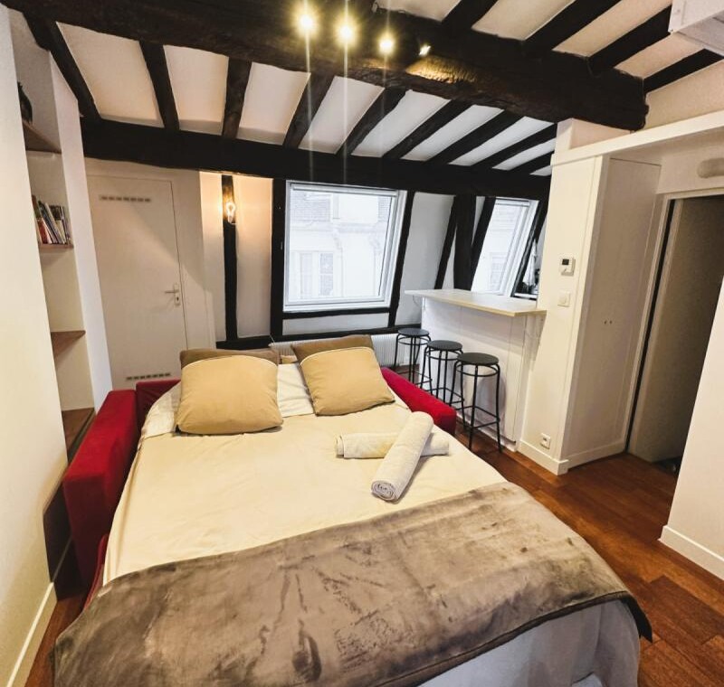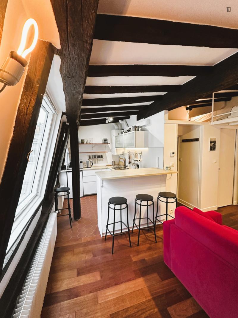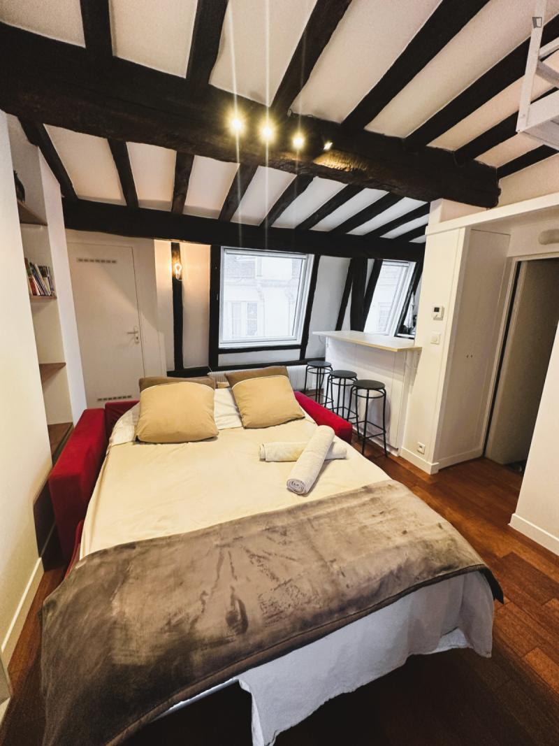 The check in is possible only during Weekdays and Saturday from 9am until 6pm. Please note, you must transfer the deposit and the admin fee to the landlord within 1 week once your request is confirmed through Uniplaces platform . The deposit is 1 month rent for bookings up to 5 months. From 6 months onwards, the deposit is 2 months’ rent. The admin fee depends on the duration of the booking : 1-5 months is 40 percent of 1 month’s rent 5-10 months is 60 percent of 1 months rent and staying 10 months or more is 75 percent of 1 months rent. Furthermore, it’s mandatory to send the tenancy agreement together with requested documents : ID / Passport/ Work contract/ University acceptance letter if applicable/ Recent paychecks/ Last tax declaration/ Guarantor documentation, ID or passport with recent payslips and proof of address and/or rent receipt, certificate from your previous landlord, etc. The check in is possible only during weekdays from 10am until 3pm. CAF/APL accepted. Your landlord speaks: English, French, Korean. Payment method: bank transfer, credit card payment, automatic monthly payment. As per the French law a home insurance will be asked at the latest upon check in, landlord can help you get it if needed. Exit inventory fee may apply for rentals of less than one year the amount is specified before the contract is signed. Your landlord does not live on the property. Furnished studio apartment measuring 23.9 m located on the 4th and top floor without lift of a character building in the heart of the Latin Quarter 5th arrondissement. Recently renovated, it combines old-world charm beamed ceilings, parquet flooring, terracotta tiles with modern amenities. Overlooking the courtyard, it is quiet and bright. It includes a lounge area with a sofa bed and Wi-Fi, a fully equipped open-plan kitchen with a breakfast bar, a mezzanine with a double bed limited height and a bathroom with a shower and toilet. Individual gas heating.